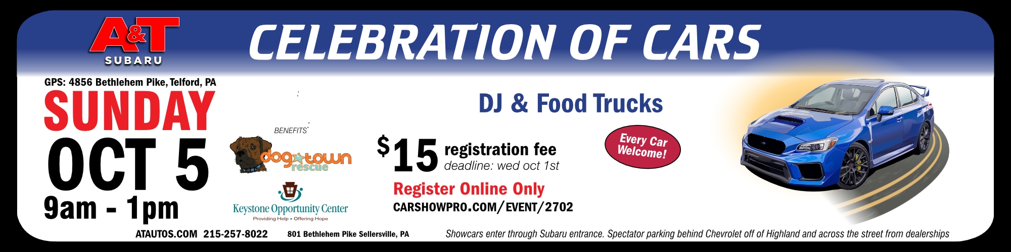 We are excited to announce that the 2025 A&T Subaru Celebration of Cars will take place on Sunday, October 5, 2025 right here at A&T Subaru. We can't wait to gather once again and make this year's event even more memorable! Registration is encouraged online, but we will have same-day registration open at both stores from 9am-11am on Show Day. The Show is held rain or shine. Register Here.