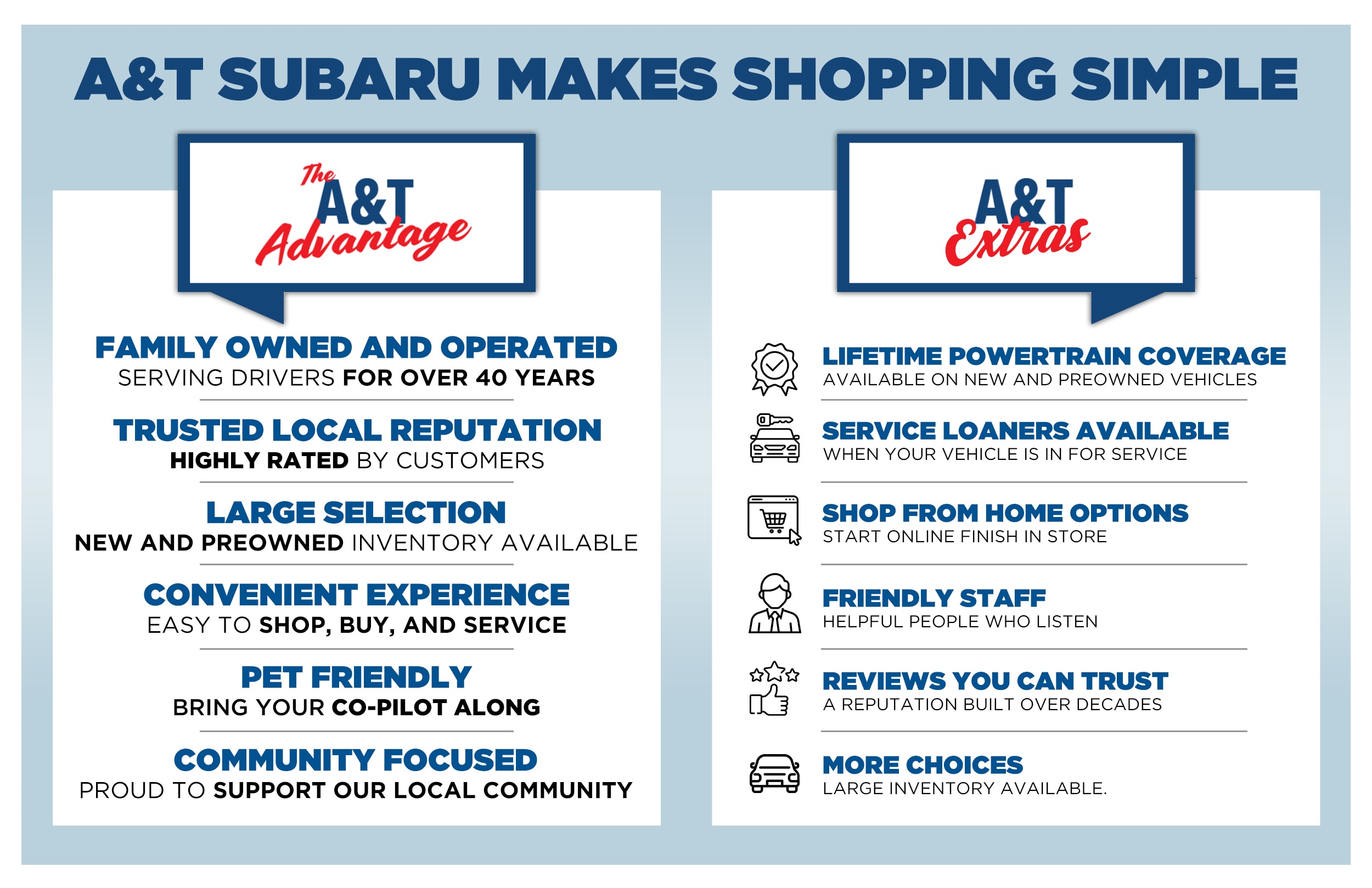 A&T Subaru Loyalty Rewards provides many exclusive benefits and perks -- savings on your next vehicle, service rewards, discounts to local merchants, and more! A Basic Membership is included with every vehicle purchase or lease.